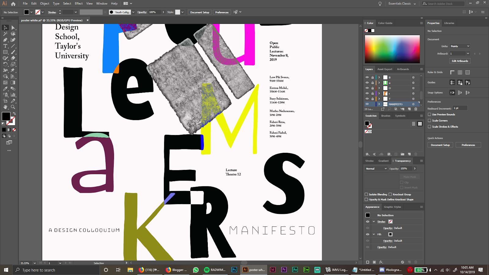 Week 8: Mr Vinod told me that the font size of the information was too big. Instead of 44pt I should bring it down to 18/21pt.He also told me that space is not your enemy. He also suggested that the manifesto and a design colloquium can be at the side of troublemakers.Later for online feedback, Mr Vinod told me that my poster design was okay.
